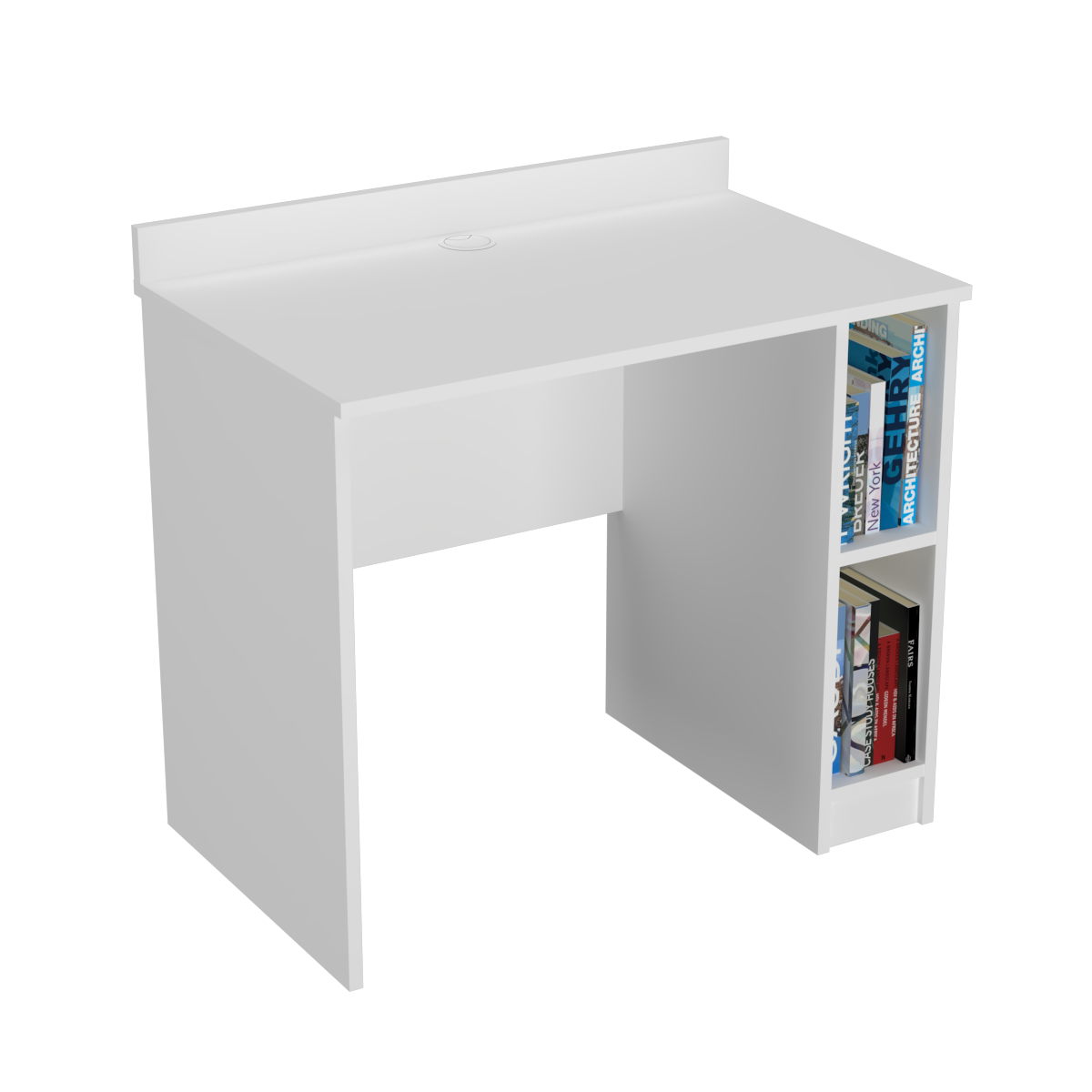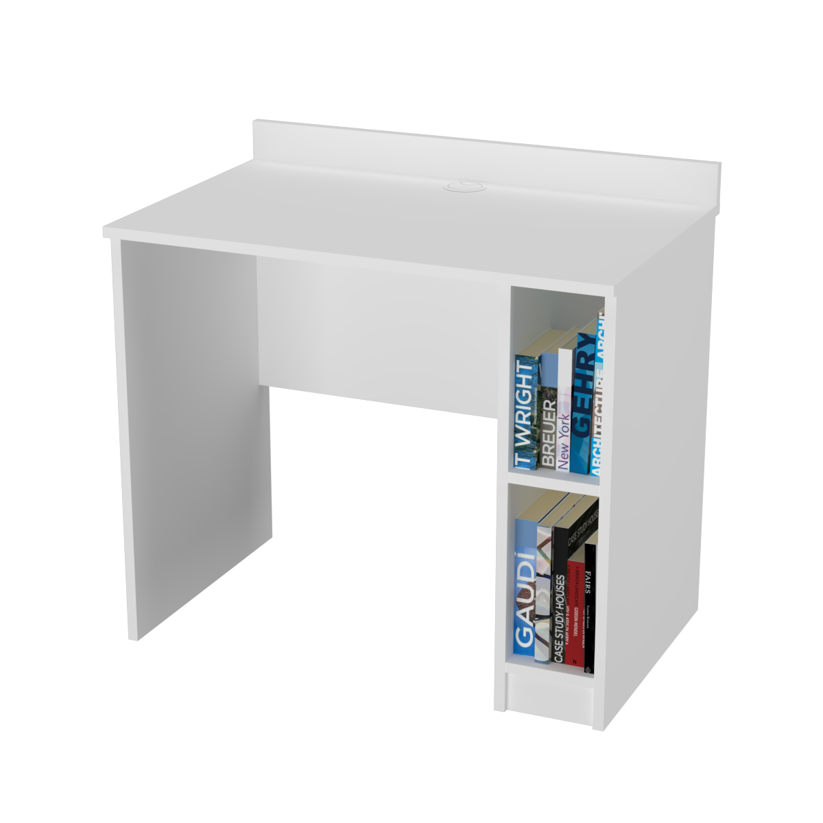 Biurko dostępne w rozmiarach od 80 do 110 cm w wersjach z półką po lewej lub prawej stronie i przepustem kablowym w połowie blatu.