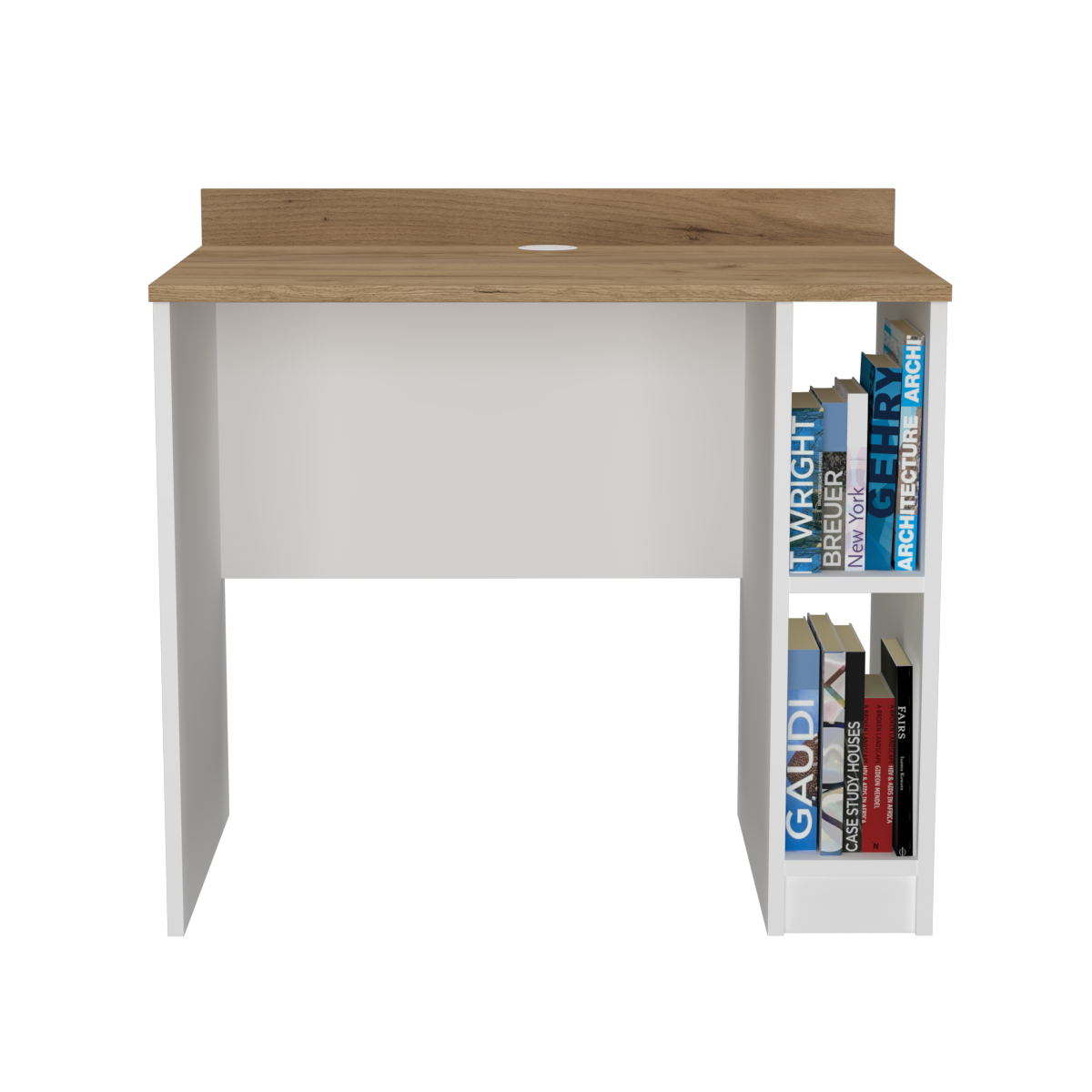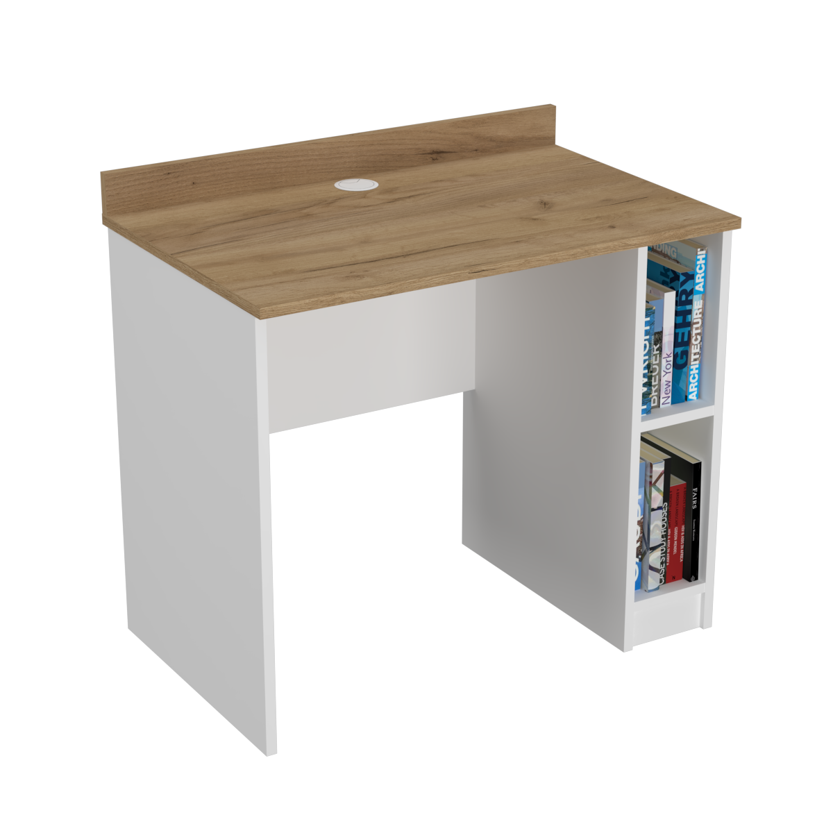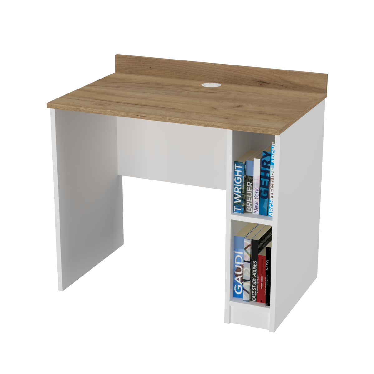 Biurko dostępne w rozmiarach od 80 do 110 cm w wersjach z półką po lewej lub prawej stronie i przepustem kablowym w połowie blatu.