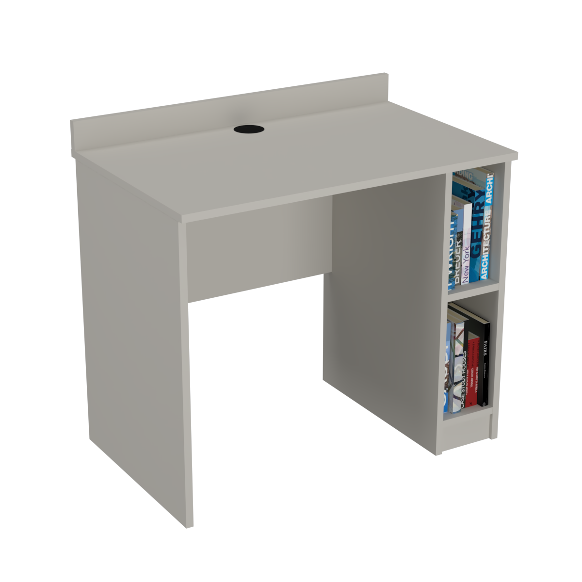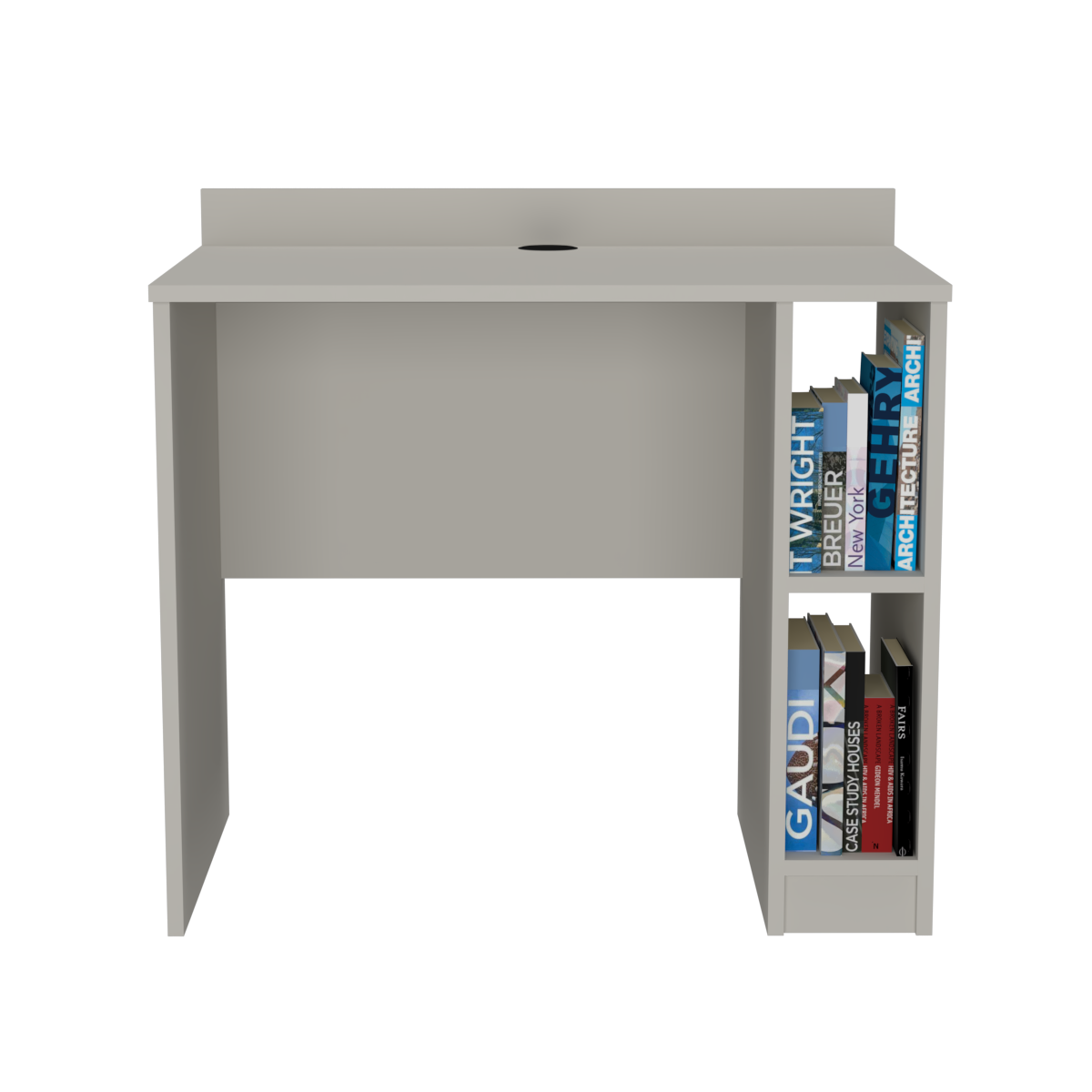 Biurko dostępne w rozmiarach od 80 do 110 cm w wersjach z półką po lewej lub prawej stronie i przepustem kablowym w połowie blatu.