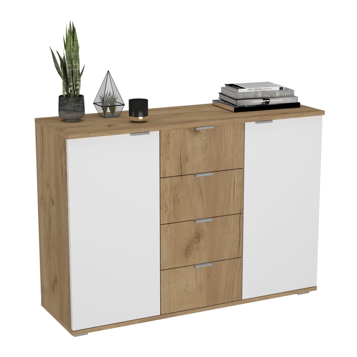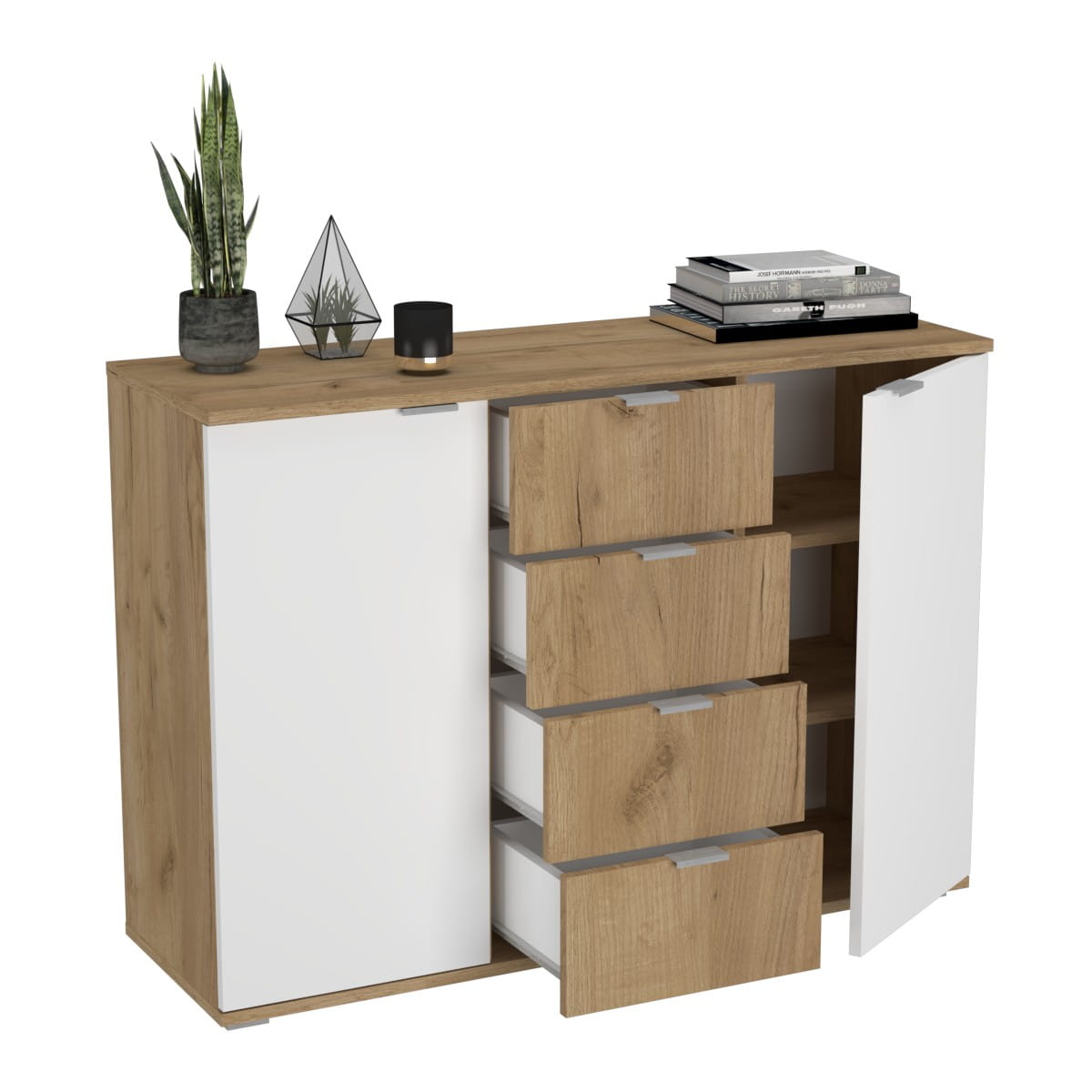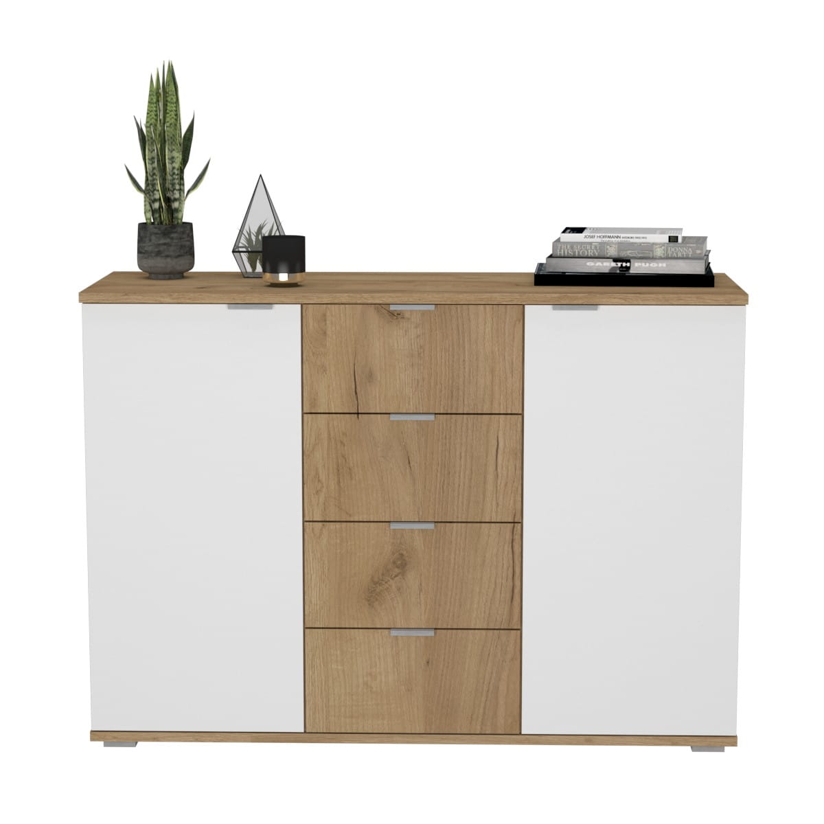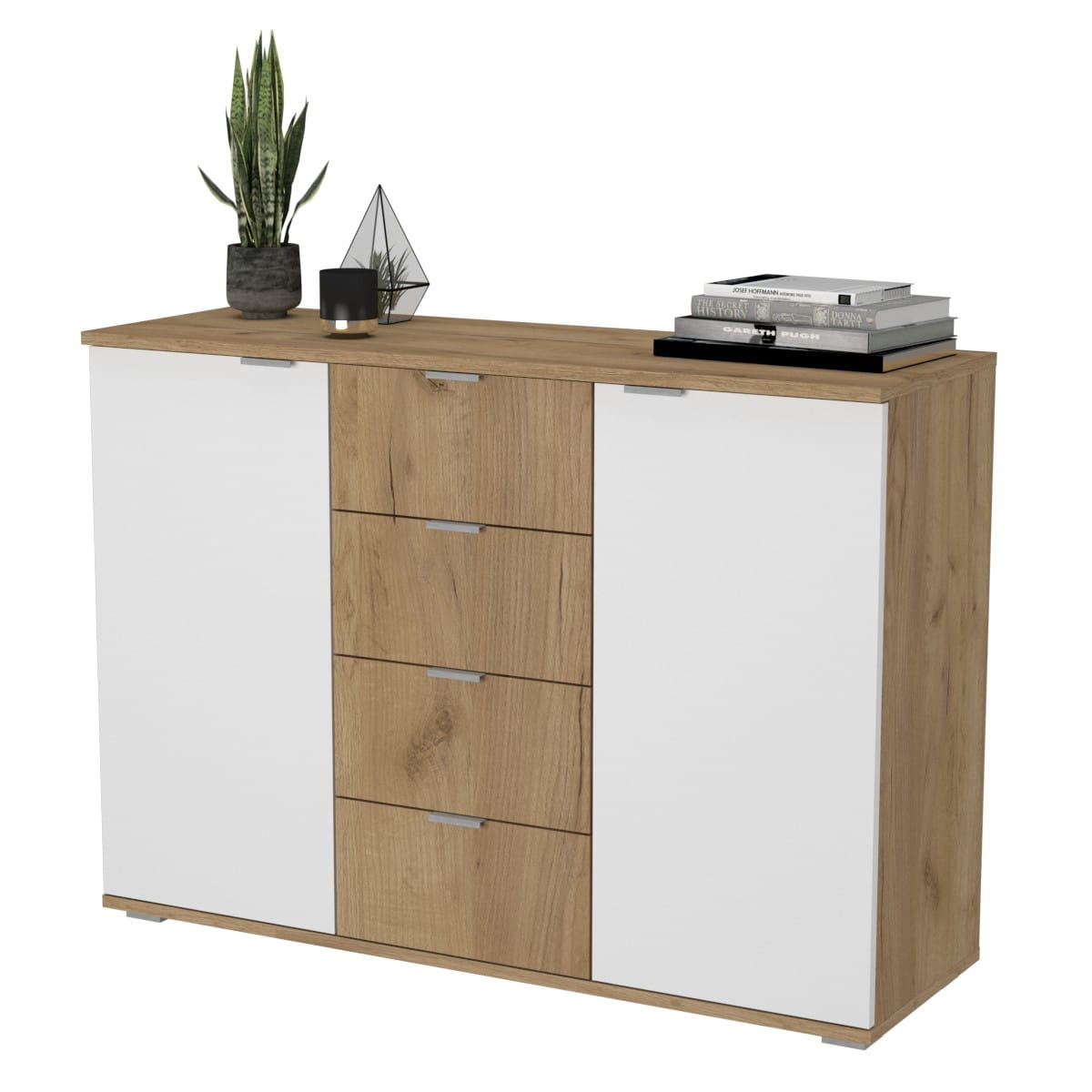 Poszukujesz komody, która nie tylko zapewni dużo miejsca do przechowywania, ale również wniesie do Twojego domu nutkę elegancji? Nasza komoda z czterema szufladami i dwiema otwieranymi szafkami to trafny wybór. To połączenie funkcjonalności i estetyki, które zadowoli Twoje oczekiwania.
