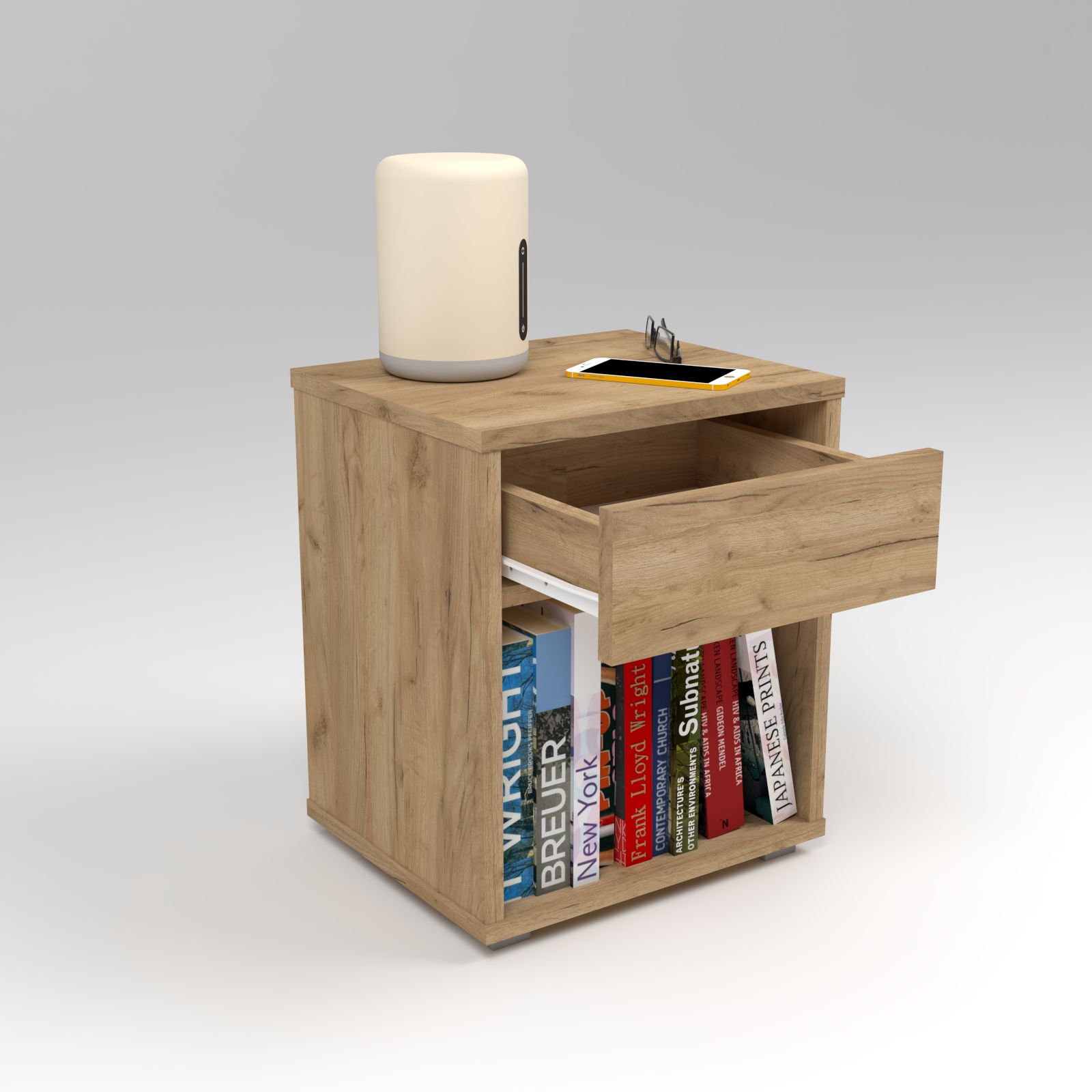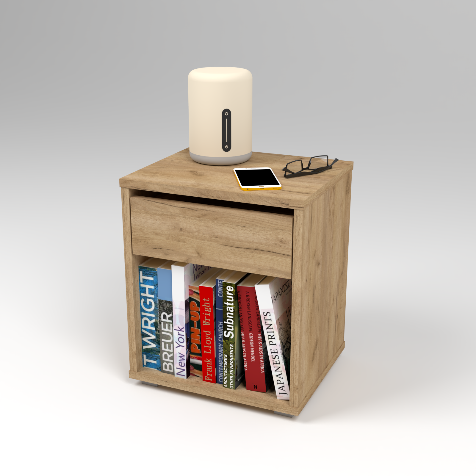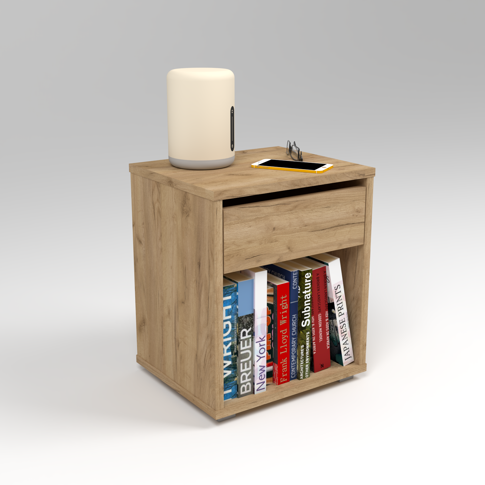 Nasza szafka nocna została stworzona z myślą o wygodzie i praktycznym wykorzystaniu przestrzeni. Jej głównym atutem jest funkcjonalna szuflada, idealna do przechowywania różnych drobiazgów w zasięgu ręki. Wszystko, czego potrzebujesz przed snem lub zaraz po przebudzeniu, znajdziesz tu w jednym miejscu. Dodatkowo, półka na książki sprawia, że możesz trzymać ulubione lektury czy magazyny blisko siebie. To doskonała opcja dla miłośników czytania, którzy cenią łatwy dostęp do literatury, nie wychodząc z łóżka. Szafka nocna wykonana jest z najwyższej jakości materiałów, co gwarantuje jej trwałość i długotrwałe użytkowanie. Jej minimalistyczny design i neutralne kolory doskonale współgrają z różnymi stylami aranżacji sypialni. Dzięki kompaktowej formie, łatwo zmieści się nawet w niewielkiej przestrzeni sypialni, dodając jednocześnie praktyczności i elegancji. To nie tylko mebel; to element, który harmonizuje aranżację i ułatwia codzienną organizację akcesoriów.